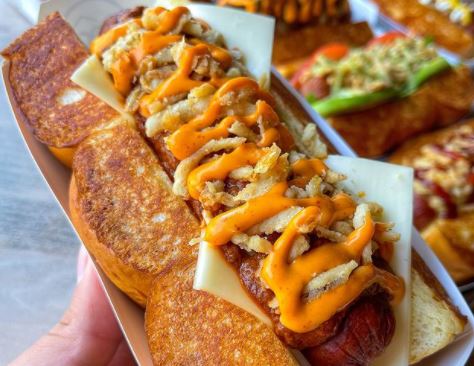 You can also dress up your hot dog in five different topping combos known as the Frontier, Philly, Bavaria, Corndog and Amigo for an additional $2 or under.