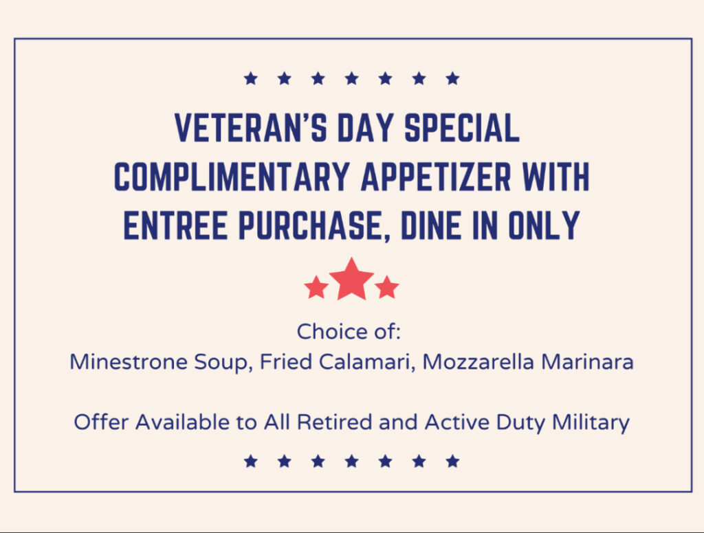 Casa Nuova is offering a complimentary appetizer with any entrée purchase (dine-in only) for all retired and active-duty military guests.