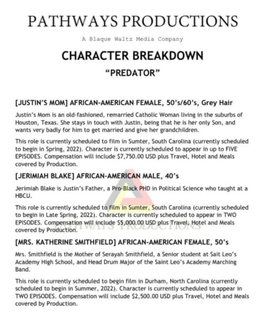 “Predator Series”Please email me with the followingHeadshot:Full Body Shot:Height:Age:Portfolio Link/Instagram Link:Titled “Predator Series” to VMManagementDallas@gmail.com.Here is some background on the characters needed:When Will Prey Be Released?