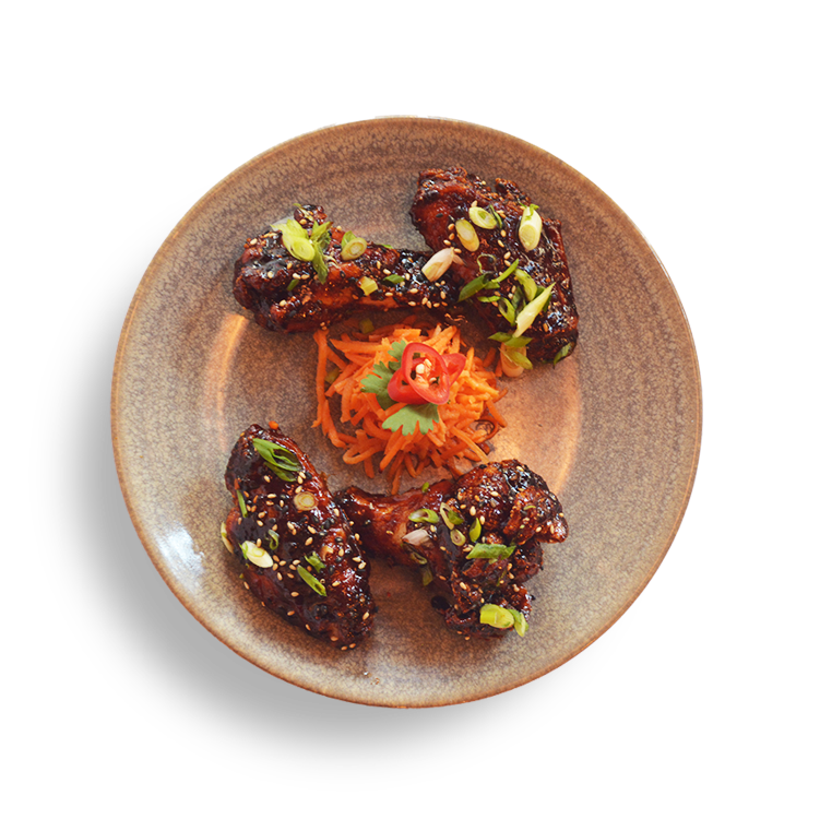 Korean Chicken Wings with sweet + spicy sauce. pickled carrot garnish. scallions. sesame seeds.