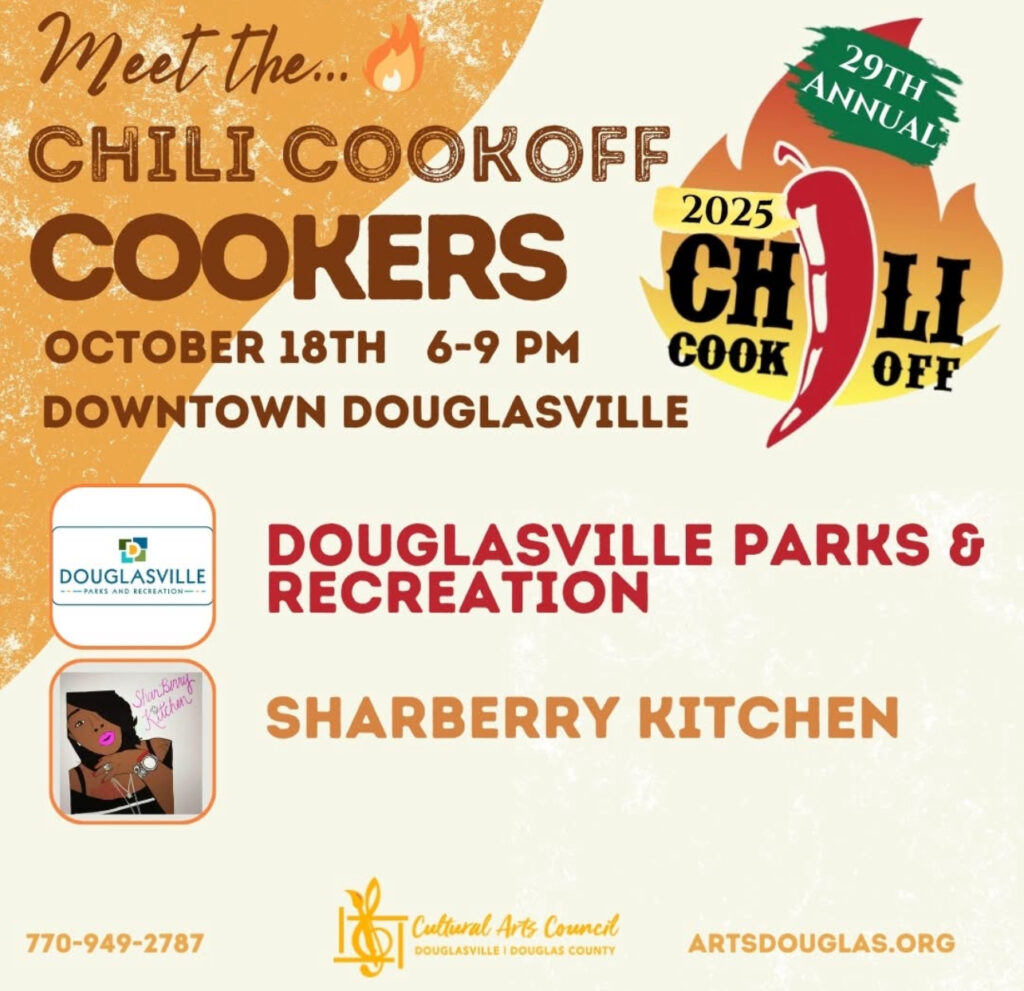 It’s chili season — and that means it’s time for the best to compete with the rest. The Douglasville Cultural Arts Council (CAC) Annual Chili Cook Off is set for October 18th, 6-9 PM, at O’Neal Plaza in downtown Douglasville.