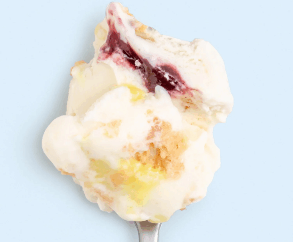 This celebratory scoop combines rich buttercream ice cream with soft pieces of gluten-free cake, swirled with bright lemon curd and regal blackberry jam. It’s nostalgic, it’s joyful, and it tastes exactly like sneaking an extra slice at a reception – only colder and somehow even better.