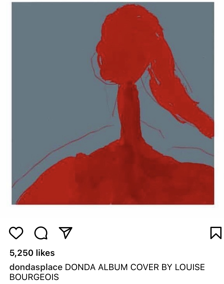 No official word yet, but social media is abuzz on platforms like @dondasplace on Instagram with an image purportedly from visual artist Louise Bourgeois, a French sculptor and plastic artist and naturalized American citizen who painted a red figure that some are saying is the cover art for DONDA.