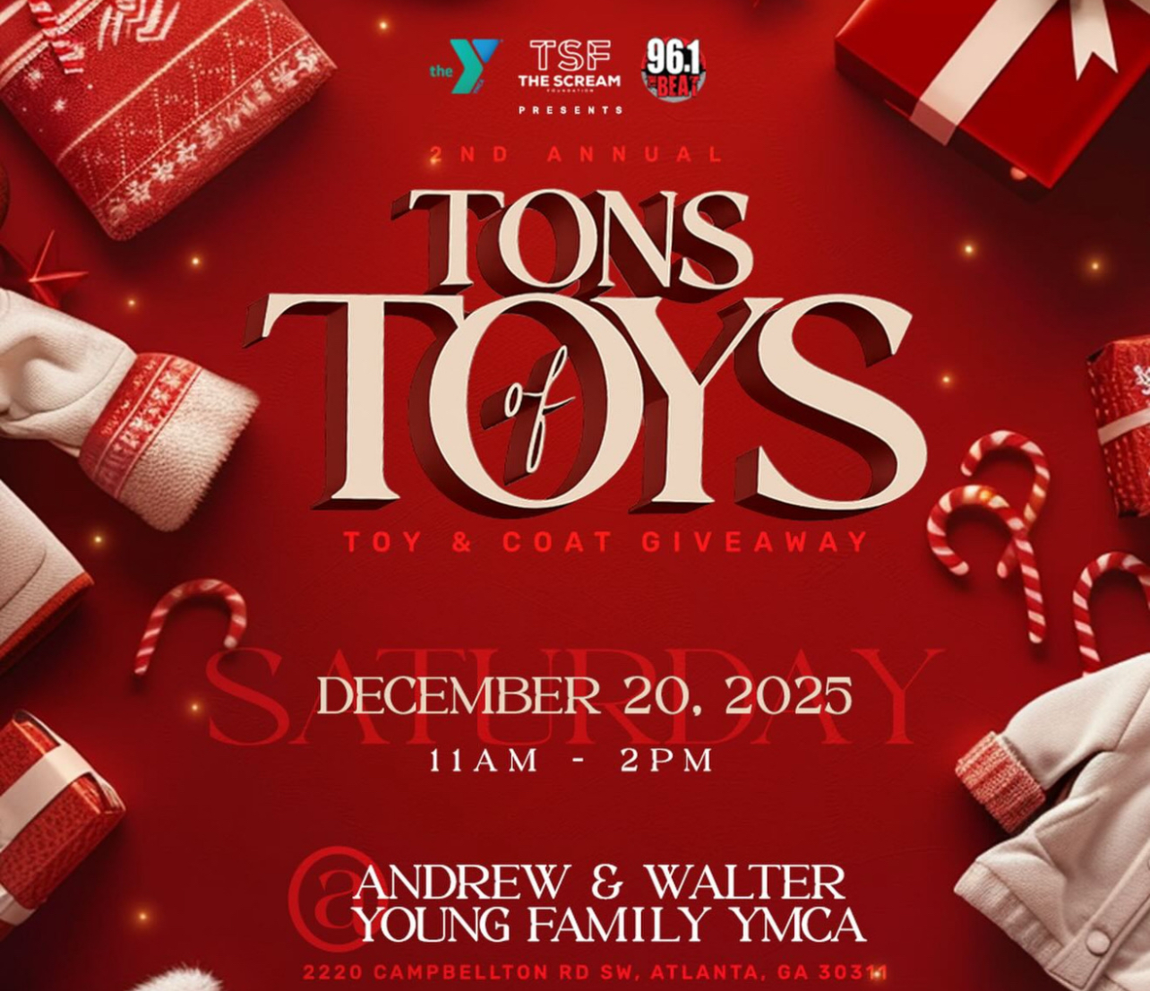 On Saturday, December 20, 2025, the YMCA of Metro Atlanta, in partnership with DJ Scream and his nonprofit The Scream Foundation (TSF), along with 96.1 The Beat, will host the 2nd Annual Tons of Toys Toy & Coat Giveaway. The event promises to bring smiles to hundreds of children and families by distributing over 1,000 toys and coats — all completely free.